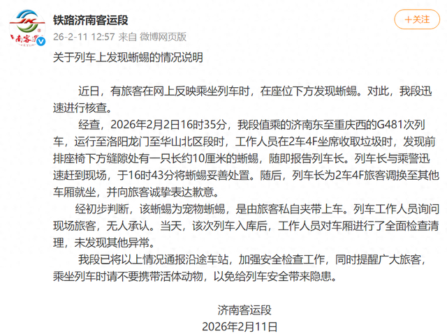 经查,2026年2月2日16时35分,我段值乘的济南东至重庆西的G481次列车,运行至洛阳龙门至华山北区段时,工作人员在2车4F坐席收取垃圾时,发现前排座椅下方缝隙处有一只长约10厘米的蜥蜴,随即报告列车长。列车长与乘警迅速赶到现场,于16时43分将蜥蜴妥善处置。随后,列车长为2车4F旅客调换至其他车厢就坐,并向旅客诚挚表达歉意。