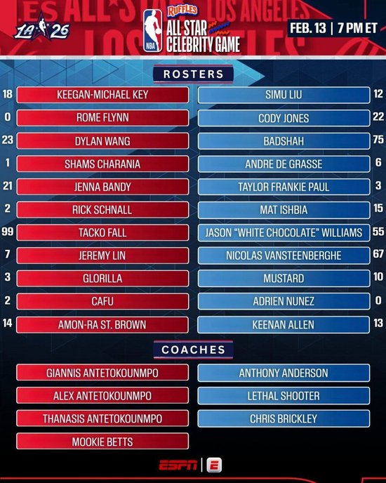 白队球员:基根-迈克尔-基(演员)、罗姆-弗林(演员)、王鹤棣(中国演员)、Shams(NBA知名记者)、詹娜-班迪(网红)、里克-施纳尔(黄蜂老板)、塔科-法尔(前NBA球员)、林书豪(前NBA球员)、格洛丽拉(歌手)、卡福(前巴西男足队长)、阿蒙-拉-圣布朗(NFL球员)