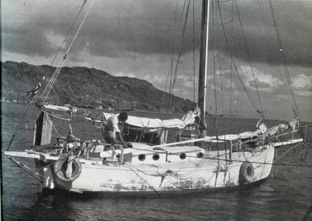 在塔希提岛,他们遇到了一艘美丽的十八世纪帆船,整装待航——那是布莱(Bligh)船长的“邦蒂”号(Bounty)的复制品。电影《叛舰喋血记》(The Mutiny on the Bounty)当时正处于紧锣密鼓地拍摄中,马龙·白兰度(Marlon Brando)饰演弗莱彻·克里斯蒂安(Fletcher Christian),特雷弗·霍华德(Trevor Howard)饰演布莱舰长。彼得·唐瓦尔德甚至还争取到了一个小配角,通过饰演一名叛变的水手每天赚取7美元。令西蒙娜失望的是,她未能在当地教育系统中获得一份职位,这意味着她只能返回马提尼克。由于唐瓦尔德的签证即将到期,他也必须离开塔希提。于是他决定先航行至夏威夷,再从那里横渡太平洋前往加利福尼亚,探望居住在那里的父母。然而,在经历四周航行后抵达檀香山时,他放弃了前往旧金山的艰难航程——那将会是一段漫长的逆风航行——而是选择顺风返回帕皮提(Papeete)。在那里,他又迅速卷入了一段恋情,但这次恋爱冒险很快便告终结,因为西蒙娜此时已经决定,仍然要陪伴他继续前往欧洲的航程。唐瓦尔德写道:“再次重聚是多么令人兴奋。我们彼此承诺,再也不分开。”