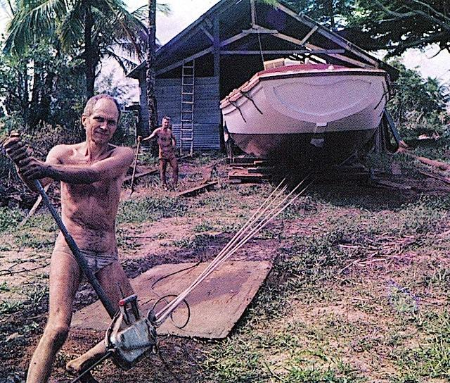 唐瓦尔德早已潜心研究霍华德·查佩尔(Howard Chapelle)和纳撒尼尔·赫雷肖夫(Nathaniël Herreshoff)等美国古典设计大师的线型图,同时也通过与特立独行的船舶设计师菲尔·博尔杰(Phil Bolger)富有成效的通信而获益良多。这些影响清晰地体现在逐渐于雨林边缘成形的那优美、修长的船体线条之中。除了将砍伐下来的原木锯成船板这一工序外,唐瓦尔德几乎独自完成了所有的工作。他将自己的梦想之船命名为“阿尔忒弥斯·皮泰阿斯”号(Artemis de Pytheas),以纪念古希腊著名探险家皮泰阿斯(Pytheas),并采用了双层船壳设计以增加刚度。当倒置建造的船壳完工后,彼得在没有任何外界帮助的情况下,利用一套精巧的滑轮组和绳索系统,成功地将这个庞然大物翻转到了由20个卡车轮胎和100个汽车轮胎铺成的“床”上。这项工作耗时一周,自然引起了当地居民的极大关注。