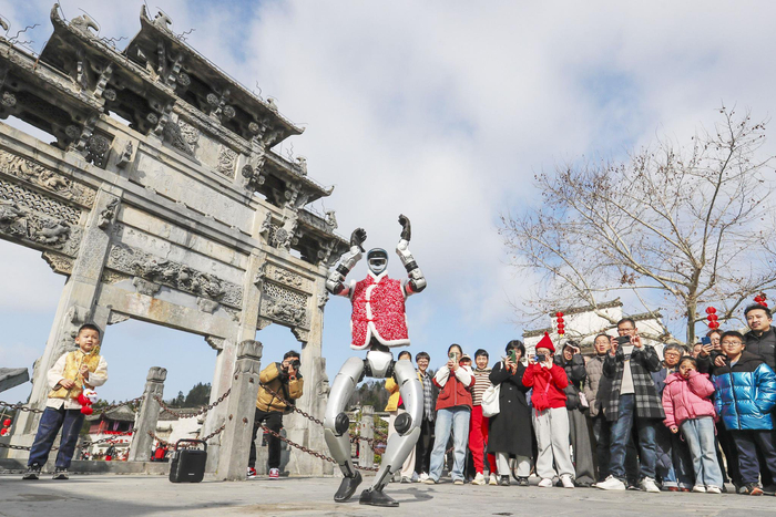 “2026年的中国春节有望成为近年来最热闹、最令人期待的旅游季。”国际旅游行业媒体《旅行与旅游世界》评价道,“春节期间亿级规模的集中出行潮是中国国内旅游业发展、区域经济增长的重要引擎,更是推动旅游产业持续扩张的关键驱动力。” 出彩,开启新春的新体验红色为春节添彩,年味与初心交融。新春第一天,贵州遵义会议纪念馆馆长赵薇早早守候在会址广场,与工作人员一起为到此参观的首位游客发放了精心准备的纪念礼包。2026年是红军长征胜利90周年。怀着深深的敬仰,不少游客选择在春节假期来到这里重温伟大征程。据统计,假期前三天,纪念馆累计接待游客6.6万人次。新年新出发。红火的春节旅游市场,昭示着旅游业的发展方向。 2月18日,游客在安徽省黟县西递古村观看机器人表演。新华社发(施亚磊 摄)