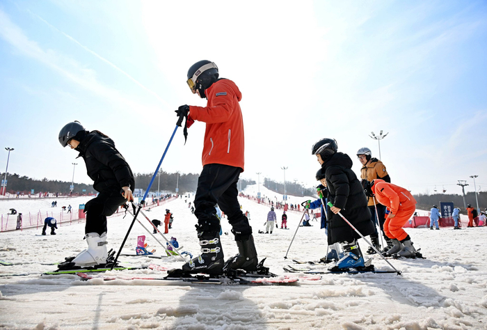 2月13日,游客在青岛西海岸新区融创藏马山滑雪场学习滑雪。当地以“冰雪+文化”“冰雪+旅游”聚人气、促消费、添年味。新华社记者 李紫恒 摄